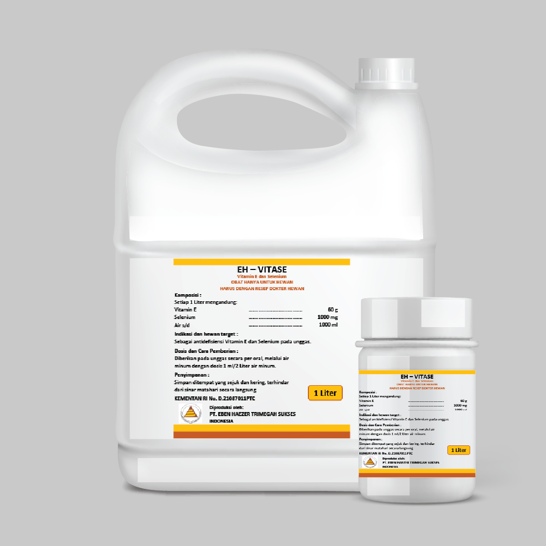 EH-VITASEFarmasetik Terbatas CairSebagai antidefisiensi Vitamin E dan Selenium pada unggas. Konsultasi Dosis dan Cara Pemberian :Diberikan pada unggas secara per oral, melalui air minum dengan dosis 1 ml/2 Liter air minum.OTHER PRODUCTS DISINFEKTAN MULTIVITAMIN PREMIX HERBAL See All